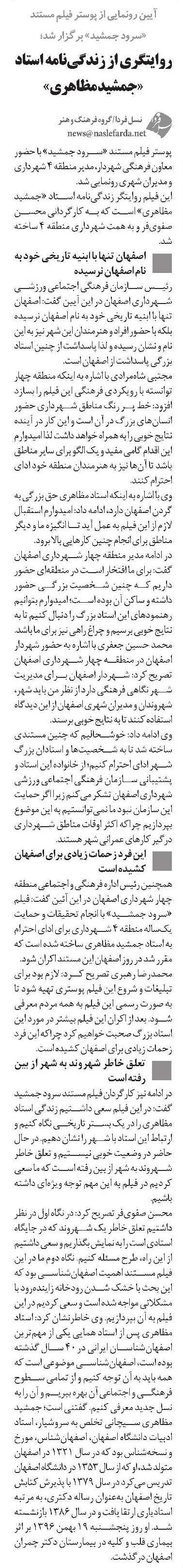 همچنین رئیس اداره فرهنگی و اجتماعی منطقه چهار شهرداری اصفهان در این آئین گفت: فیلم «سرود جمشید» با انجام تحقیقات و حمایت یکساله منطقه 4 شهرداری برای ادای احترام به استاد جمشید مظاهری ساخته شده است که مقرر شد در روز اصفهان این مستند اکران شود.